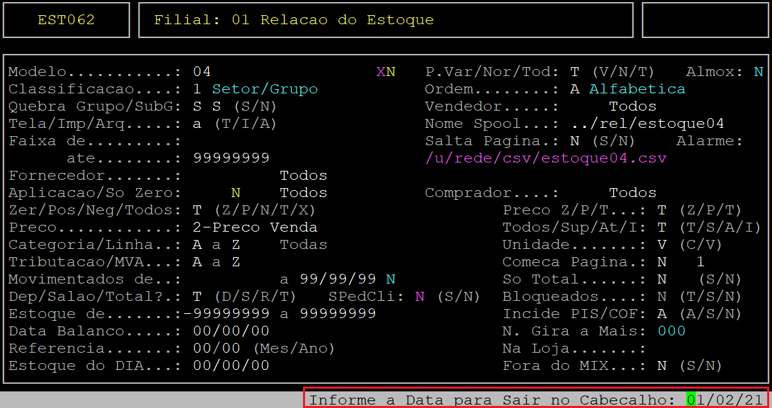 Ao ser exibido a mensagem Informe a Data para Sair no Cabecalho, digite a data desejada (com dois dígitos para dia, mês e ano) e aperte a tecla Enter para prosseguir e gerar o relatório.