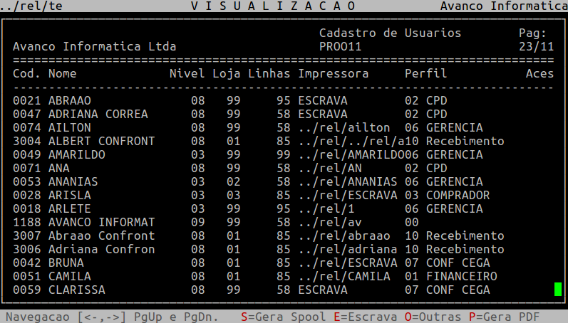 No relatório de usuários é possível verificar o código, o nome, o nível, a loja, as linhas do relatório, a impressora, o perfil e os acessos, conforme informado no cadastro de usuários.