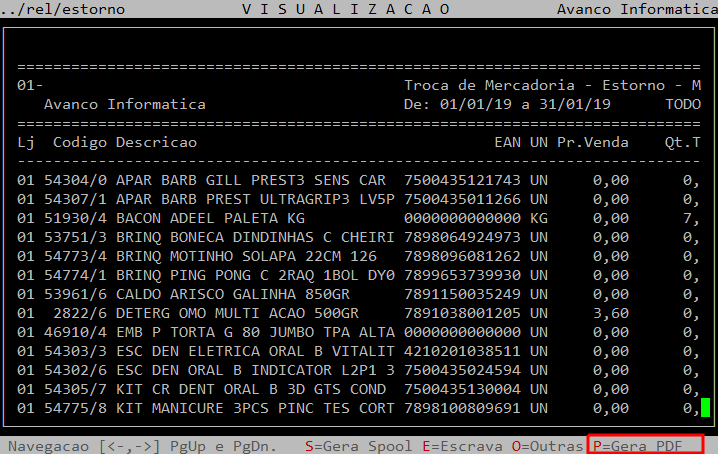 Se desejar visualizar em pdf, em seguida, deverá pressionar a tecla P e Enter até confirmar para gerar na pasta /u/rede/rel-pdf, conforme exemplo abaixo.