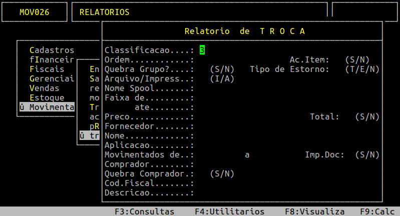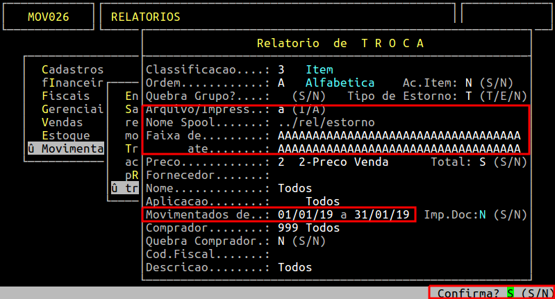Assim que preencher os campos acima, pressione a tecla Enter ou S para confirmar e gerar o relatório. Abaixo segue um exemplo da tela preenchida, ressaltando que os campos selecionados são os que necessitam de dados, os demais podem pressionar a tecla Enter para considerar o padrão que o sistema carrega.