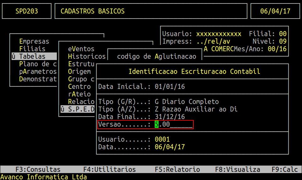 No campo Data Inicial, informe o ano e depois pressione a tecla A para alterar o campo Versão.