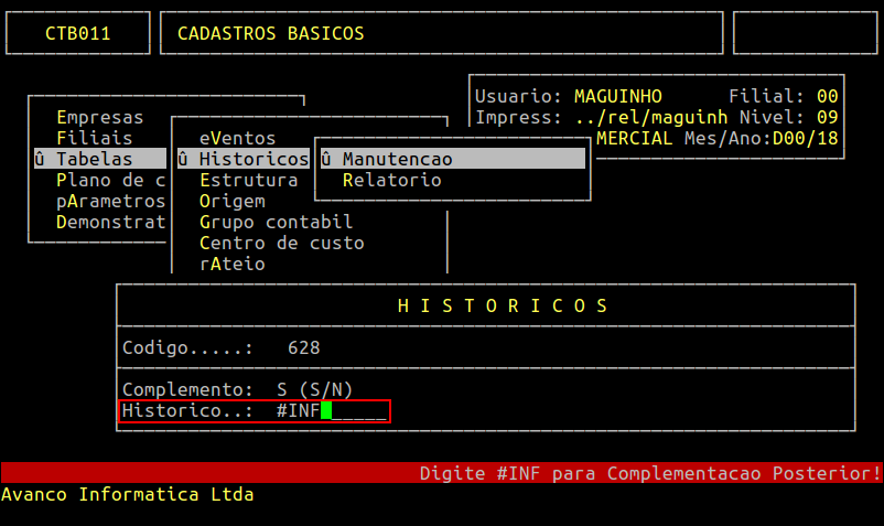 No Campo Complemento caso seja marcado com "S" consequentemente será necessário somente digitar #INF no campo Historico.