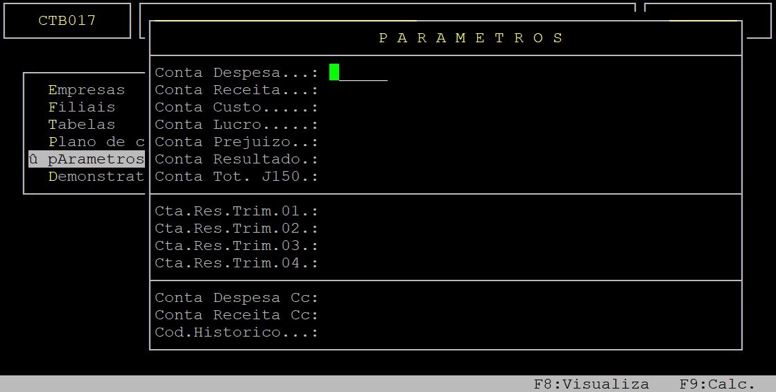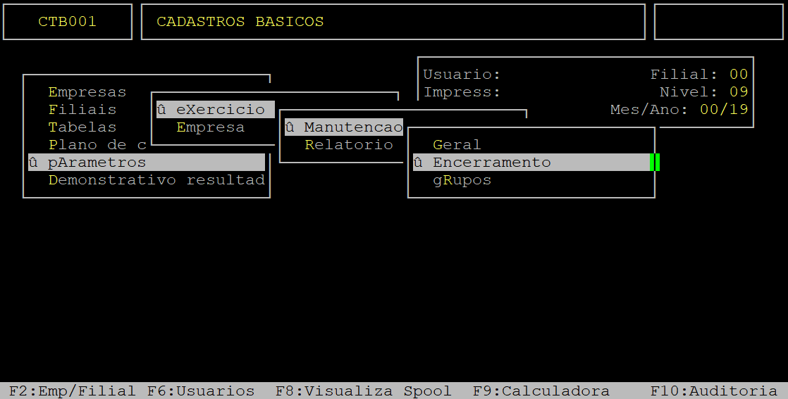 Localização: | Cadastros Basicos / Parametros / Exercicio / Manutencao / Encerramento |