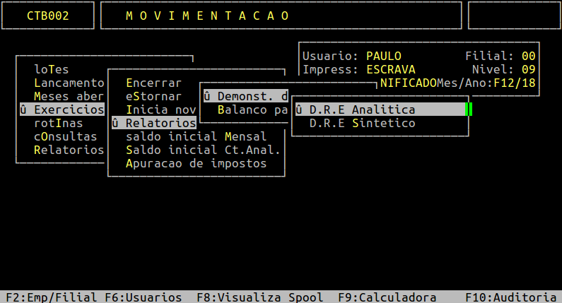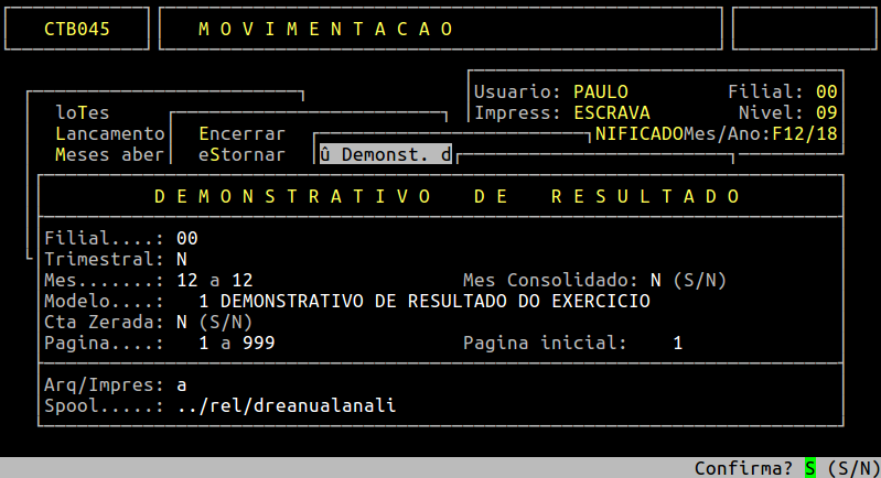 Assim que preencher os campos acima, pressione a tecla Enter ou S para confirmar e gerar o relatório do DRE, conforme o exemplo abaixo.