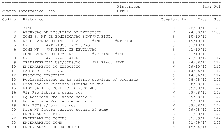 Este relatório mostra todos os históricos cadastrados no sistema, que são utilizados para Exportação e Integração Contábil.
