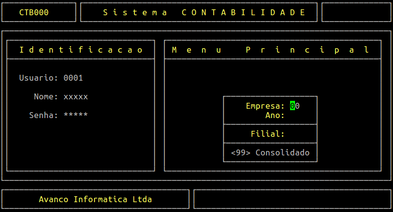Antes de acessar a rotina citada acima, informe a Empresa e o Ano, para realizar qualquer ação no módulo contábil.