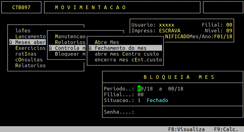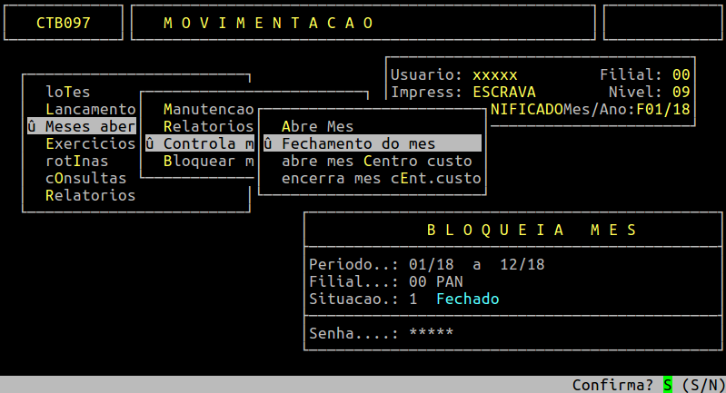 No campo Periodo, informe o mês inicial e o final para bloqueá-los, e em seguida informe a senha do usuário que está utilizando o sistema no momento. Para confirmar o bloqueio, pressione Enter ou a tecla S, conforme os exemplos seguintes.