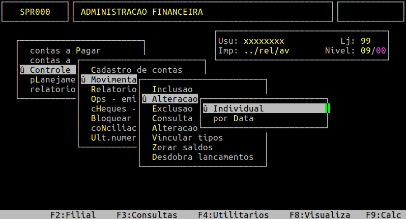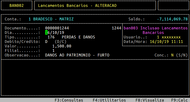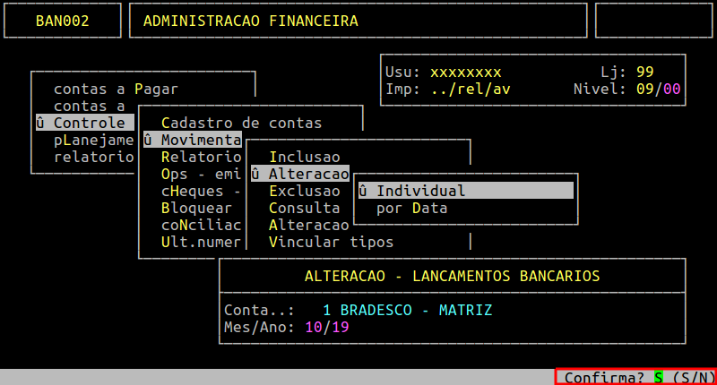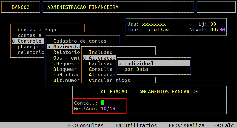 Localização: | Administracao Financeira / Controle Bancario / Movimentacao / Alteracao / Individual |