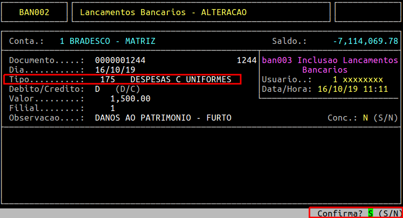 Assim que alterar os campos desejado conforme o quadro acima, pressione a tecla Enter ou S para confirmar. Abaixo segue um exemplo com a alteração do Tipo realizada na rotina, ressaltando que os dados são meramente ilustrativos.