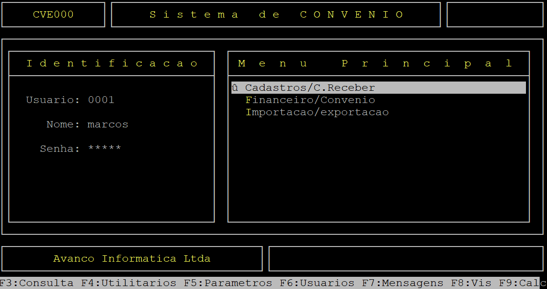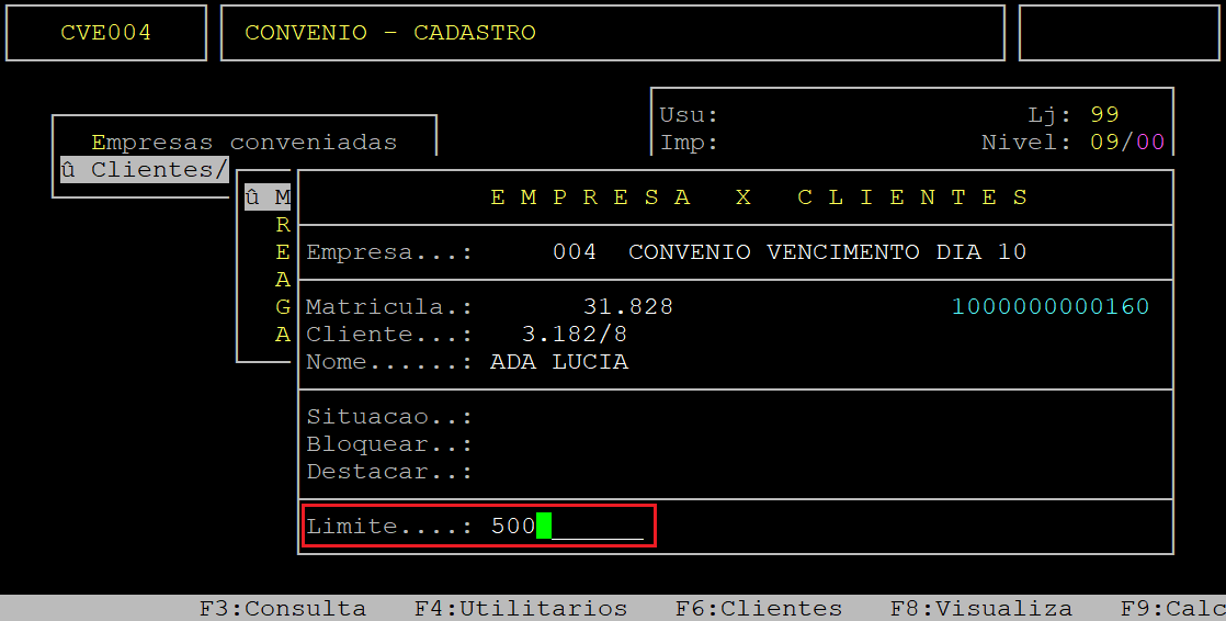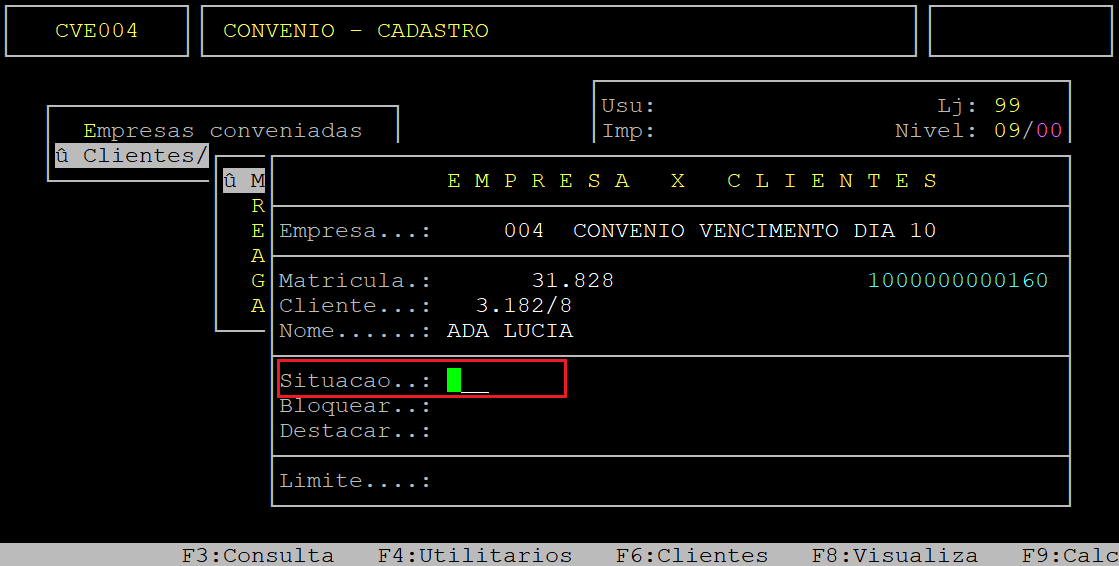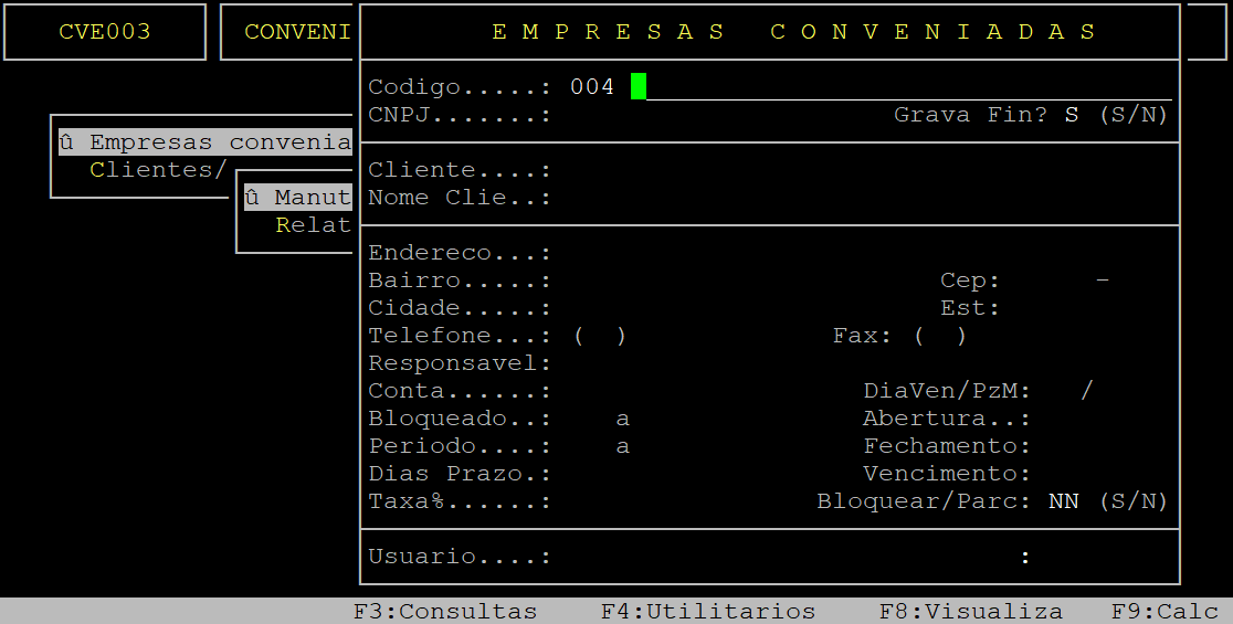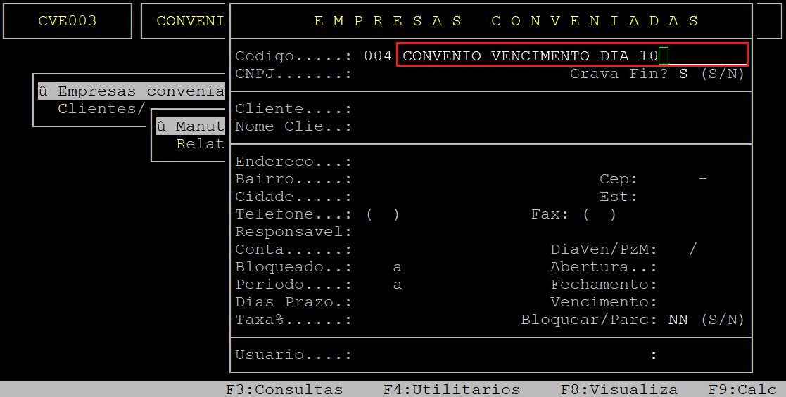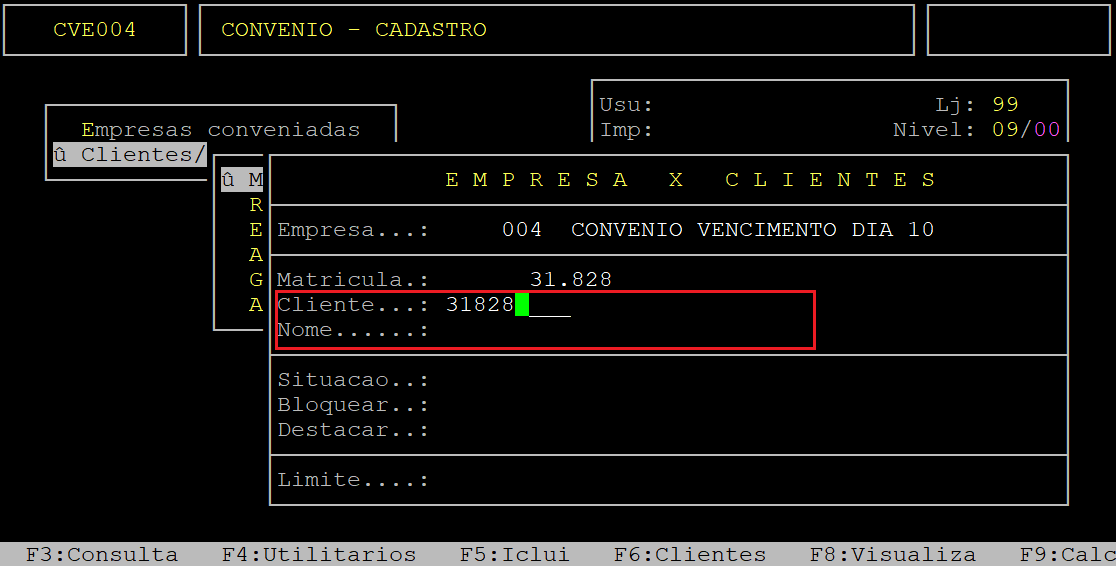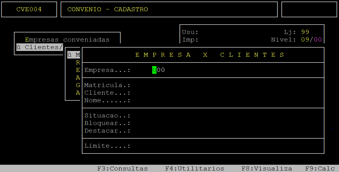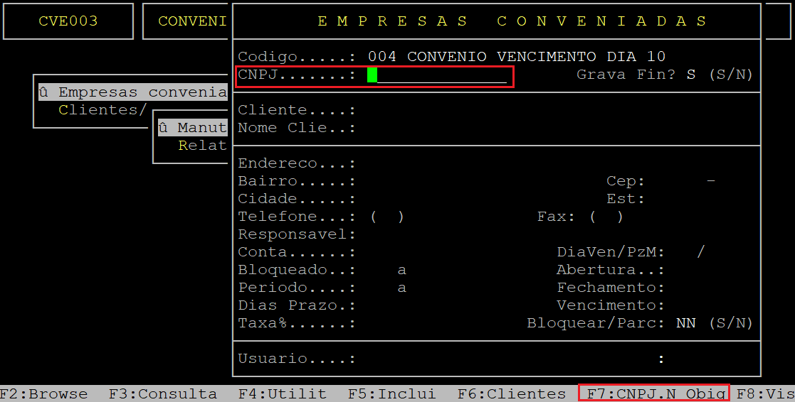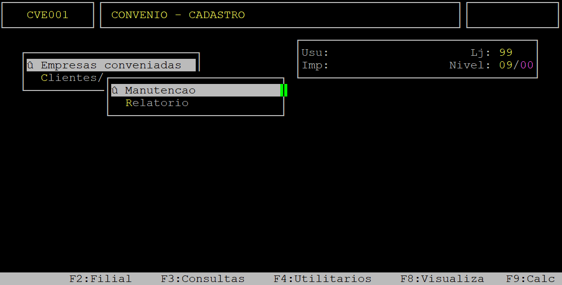 Localização: | linha de comando - cobrun integ004 / Cadastros - C.Receber / Empresas Conveniadas / Manutencao |