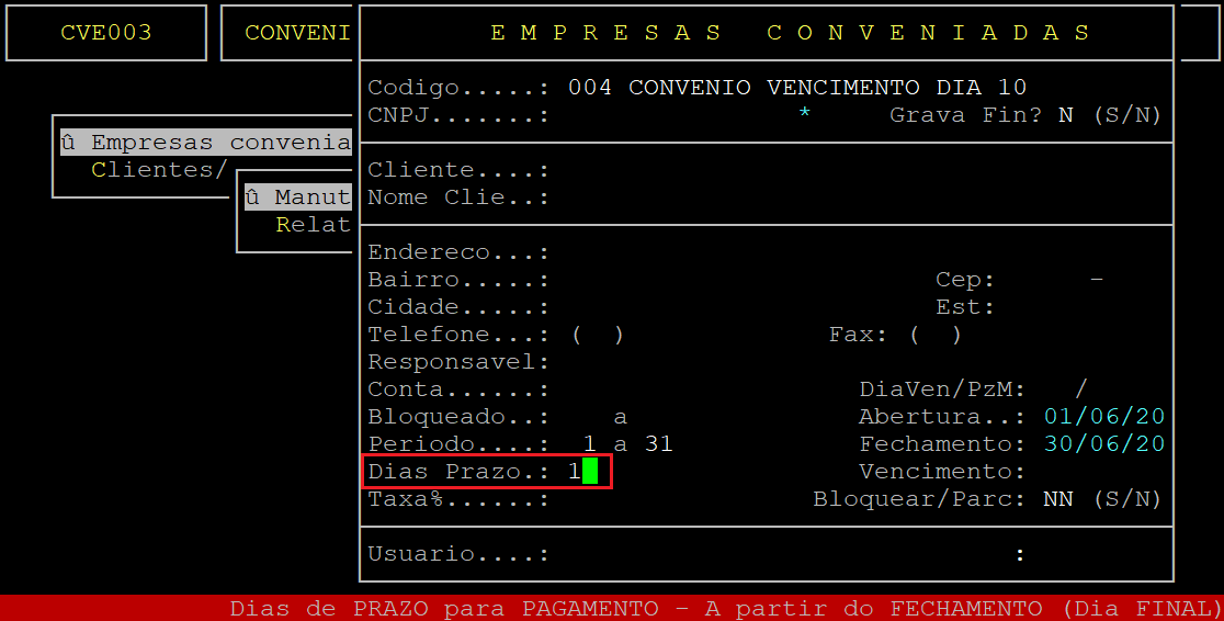 Ao selecionar a opção de não informar o CNPJ, o cursor do teclado irá direto para o campo Dias Prazo, no qual deverá informar o dia fixo para o vencimento das compras realizadas com esse convênio.