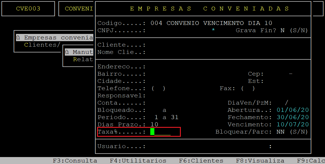 Ao alcançar o campo Taxa%, informe o percentual de acréscimo no valor do convênio e, pressione a tecla Enter. Se não desejar informar, deixa o campo sem preencher e pressione a tecla Enter para prosseguir.
