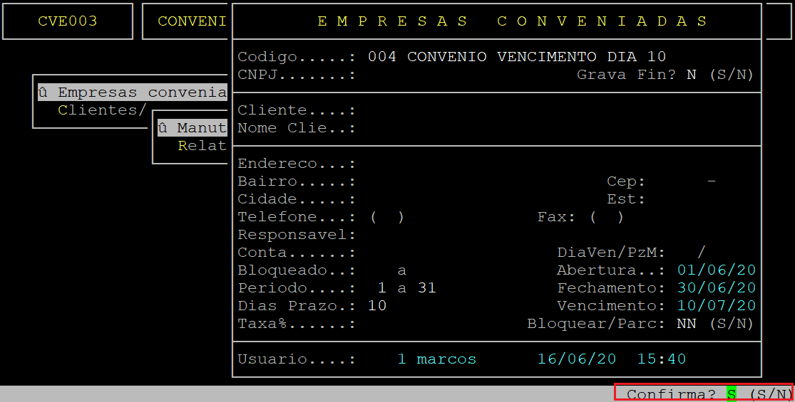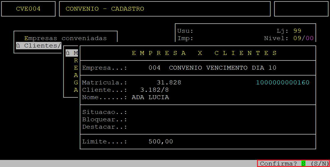 Em sequência o sistema exibirá a pergunta " Confirma? ", no qual deverá informar a letra S para confirmar.