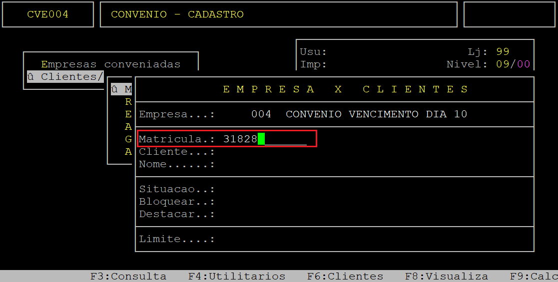 No campo Matricula, informe uma matrícula para vincular o cliente ao convênio, sendo indicado utilizar o CPF/CNPJ ou código do cliente e, pressione a tecla Enter para prosseguir.