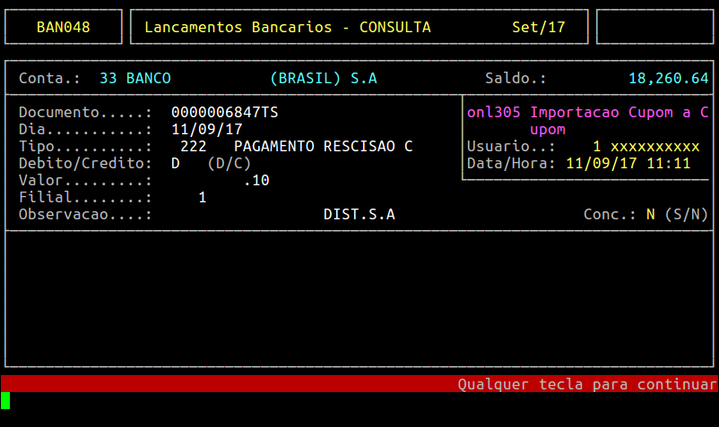 Caso seja necessário obter mais informações sobre o lançamento, basta pressionar ENTER sobre o lançamento desejado, e assim aparecerá uma tela com informações mais detalhadas conforme a imagem abaixo.