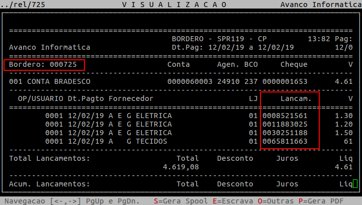 No exemplo abaixo, observe que foram listados todos os lançamentos do borderô 725 baixados na data 12/02/19 (informados no filtro).