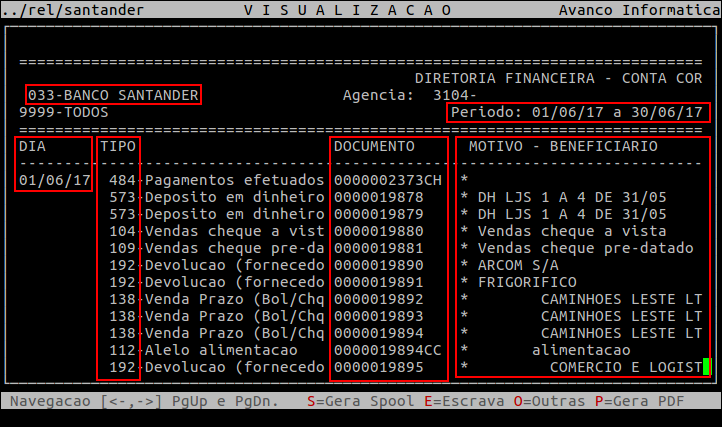 No exemplo acima podemos observar com destaque os campos com a conta, período, dia da baixa dos lançamentos, tipo gerencial da baixa, documento sequencial dos lançamentos bancários e o motivo/beneficiário, ou seja, o nome do fornecedor, cliente que pagou, tipo gerencial de venda ou pagamento.