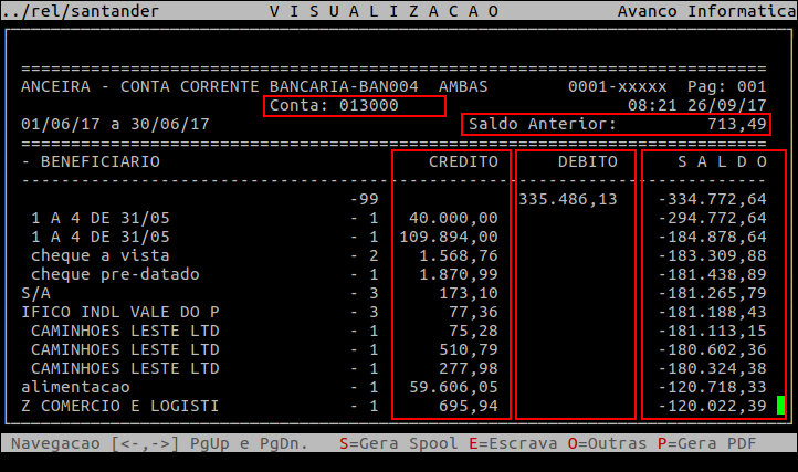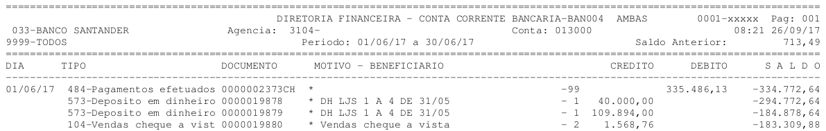 Na imagem anterior, ainda do mesmo relatório, é possível observar a coluna de receitas (Crédito), coluna de despesa (Débitos) e coluna de saldos. Além disso é possível observar o número da conta bancária e o saldo anterior ao período emitido.
