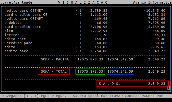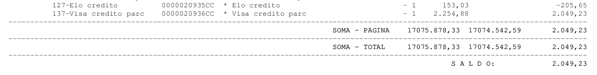 A imagem acima representa o final do relatório, é possível observar de verde o valor total de créditos e de azul o valor total de débitos e logo ao final o saldo total.