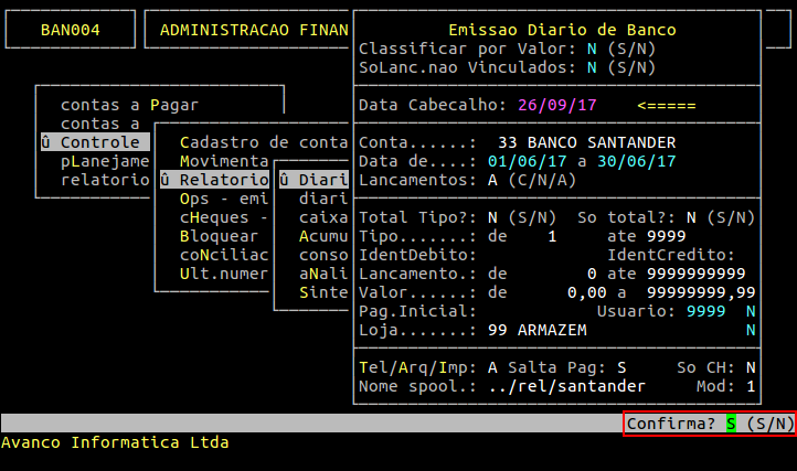 Conta: | Determina de qual conta que será emitido o relatório diário de banco. Digite o código de determinada conta ou 999 para todas, em seguida pressione ESC para prosseguir nos próximos campos. | |