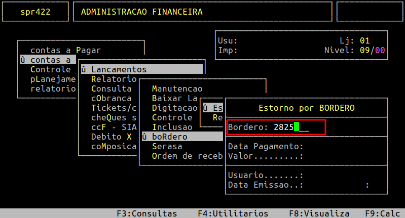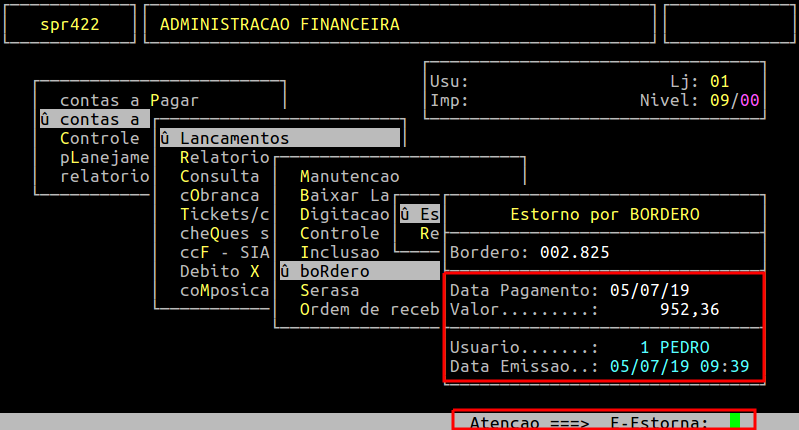 O sistema carregará os dados referentes ao borderô informado. Em seguida será exibido a mensagem " Atencao ===> E - Estorna: ", no qual para estornar deverá informar a letra E.
