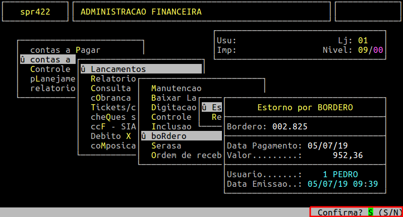 Pressione a tecla Enter para confirmar o estorno do borderô informado.