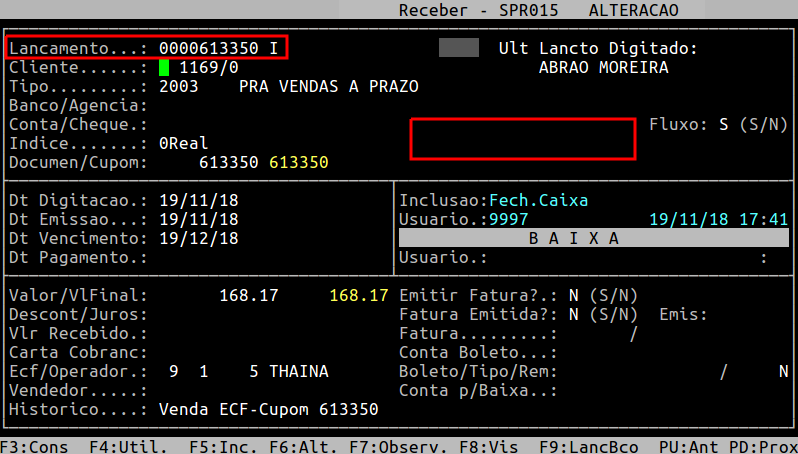 Localização: | Administracao Financeira / Contas a Receber / Lancamentos / Manutencao / Alteracao / Individual |