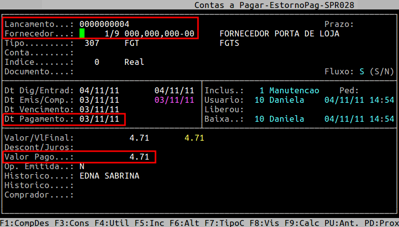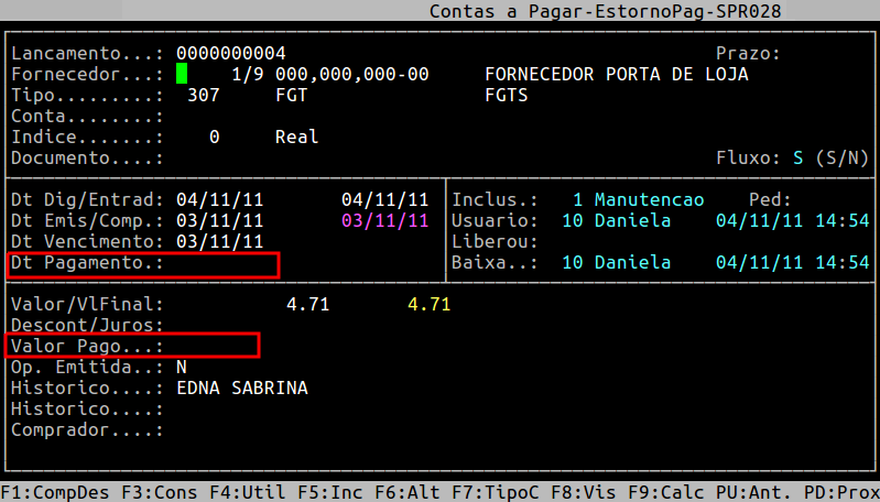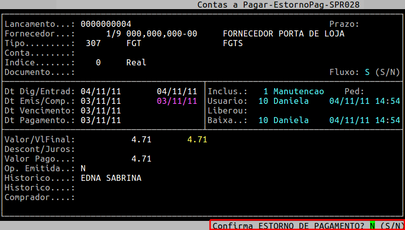 Para estornar o valor que foi pago, pressione a tecla Enter. Observe que o sistema exibirá a mensagem Confirma ESTORNO DE PAGAMENTO?, no qual deverá informar S para estornar o pagamento ou N para não estornar.