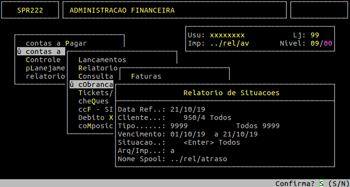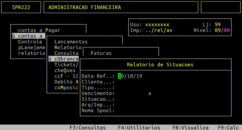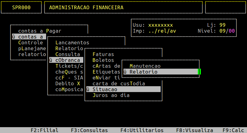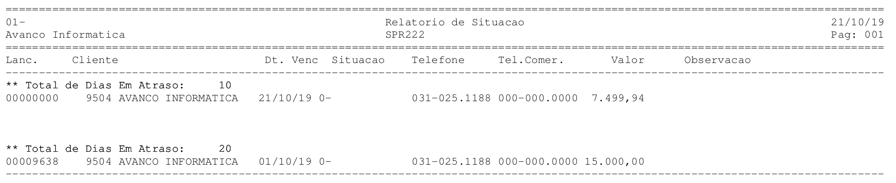 Localização: | Administracao Financeira / Contas a Receber / Cobranca / Situacao / Relatorio |