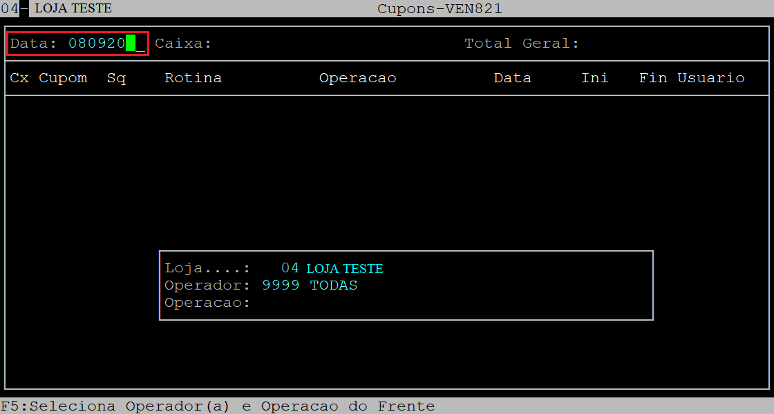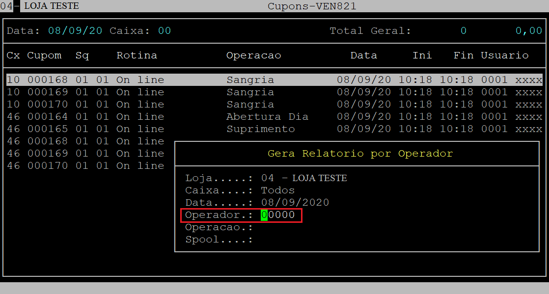 No campo Operador, informe o operador de caixa desejado (com cinco dígitos) ou pressione a tecla Enter para manter 00000 e considerar todos os operadores.
