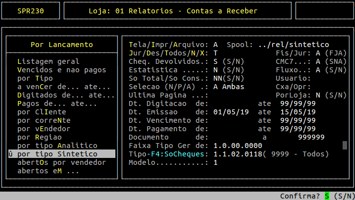 Assim que preencher os campos acima, pressione a tecla Enter ou S para confirmar e gerar o relatório, conforme o exemplo abaixo.