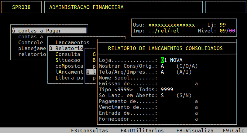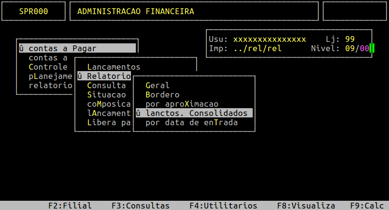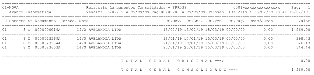 Localização: | Administracao Financeira / Contas a Pagar / Relatorios / Lanctos. Consolidados |