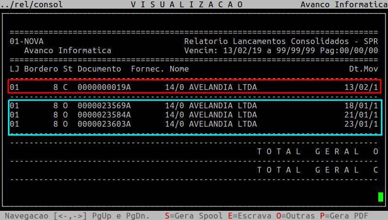Em seguida, para visualizar o relatório, pressione a tecla F8 e informe o nome dado ao Spool para visualizar na tela ou em seguida pressione P para gerar na pasta rel-pdf (diretório: u/rede/rel-pdf).