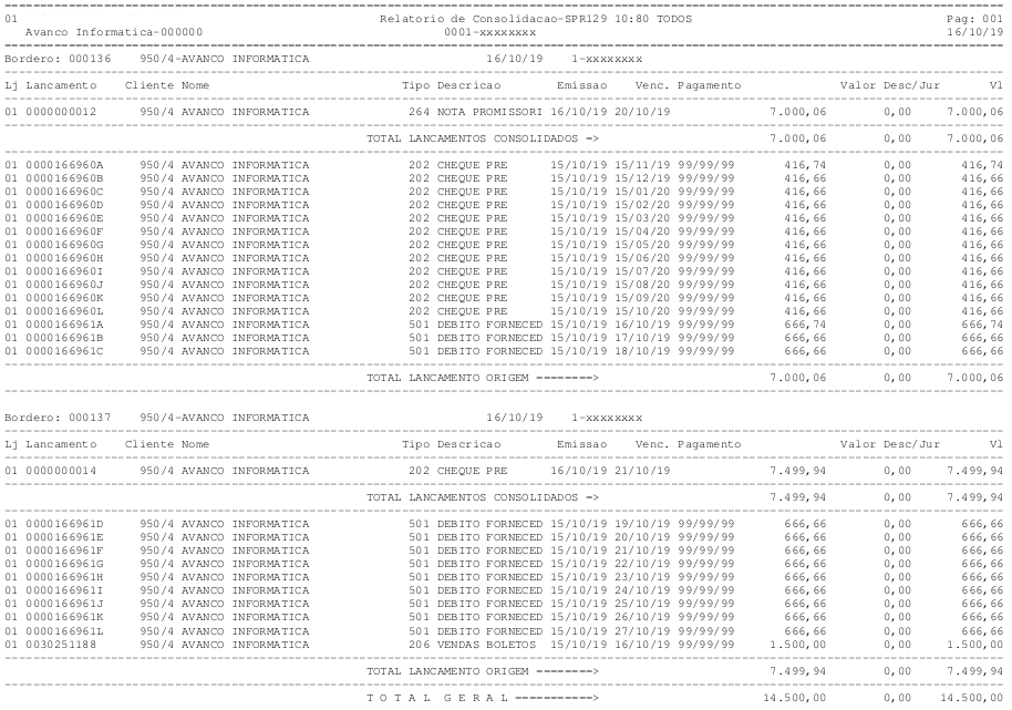 Bordero: | Informe o número do borderô gerado na consolidação ou pressione a tecla Enter para considerar todos (000001 a 999999). |