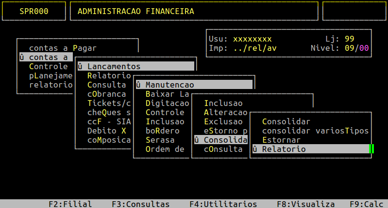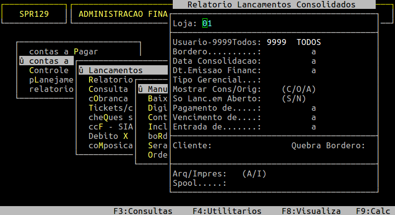 Localização: | Administracao Financeira / Contas a Receber / Lancamentos / Manutencao / Consolidacao / Relatório |