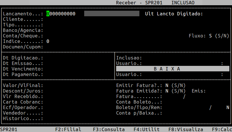 Localização: | Administracao Financeira / Contas a Receber / Lancamentos / Manutencao / Inclusao |
