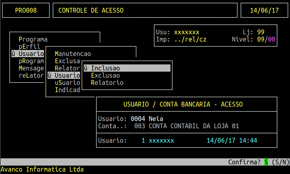 Informe no campo Usuário, o código do usuário e no campo Conta, o número da conta que ele terá acesso ou 999 para ter acesso a todas as contas.