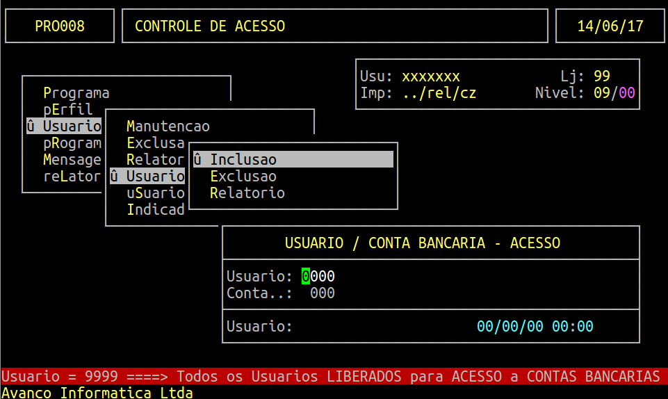 Rotina: | Usuário / Conta Bancária - Acesso |