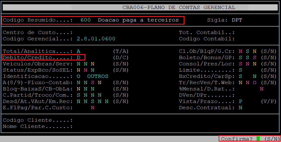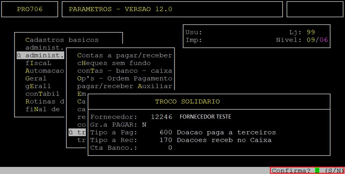Ao configurar todos os campos, o sistema exibirá a mensagem " Confirma? ", no qual deverá pressionar a tecla Enter ou S para confirmar, conforme os exemplos abaixo.