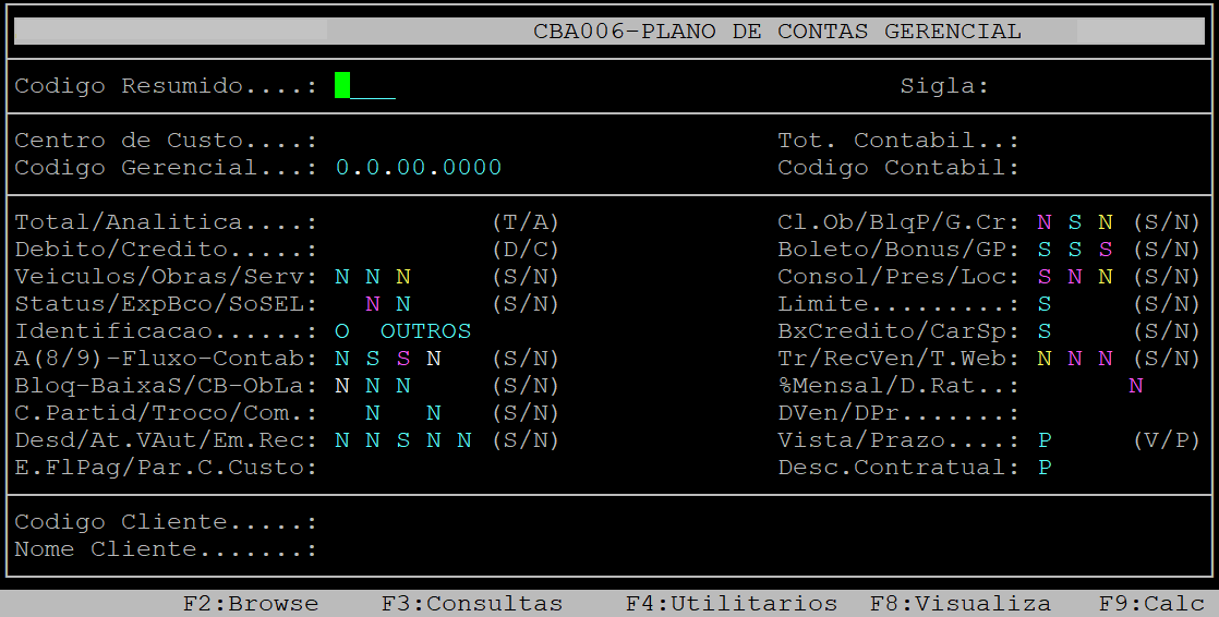 | Codigo Resumido: | Informe um código ainda não utilizado e logo em seguida, informe uma descrição da Conta Gerencial. |