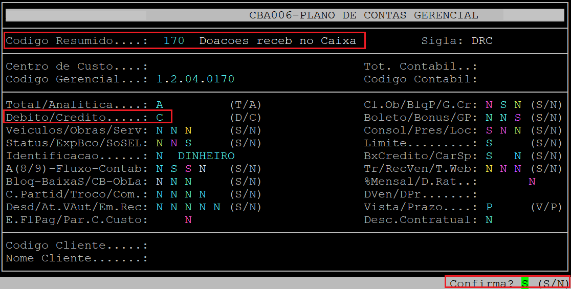 | Débito/Crédito: | Esse campo será preenchido automaticamente com conta débito (D) ou crédito (C) de acordo com o código gerencial informado. |
