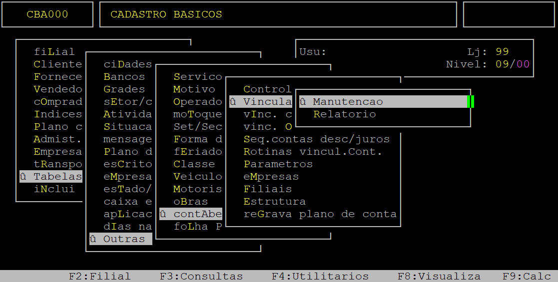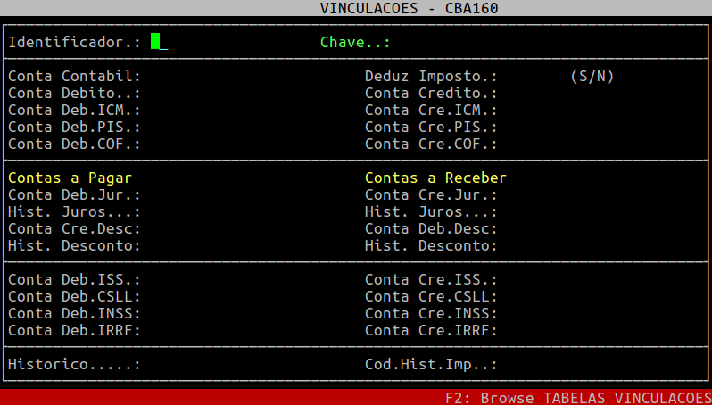 | Localização: | Cadastros Basicos / Tabelas / Outras tabelas / Contabeis / Vinculacoes / Manutencao |
