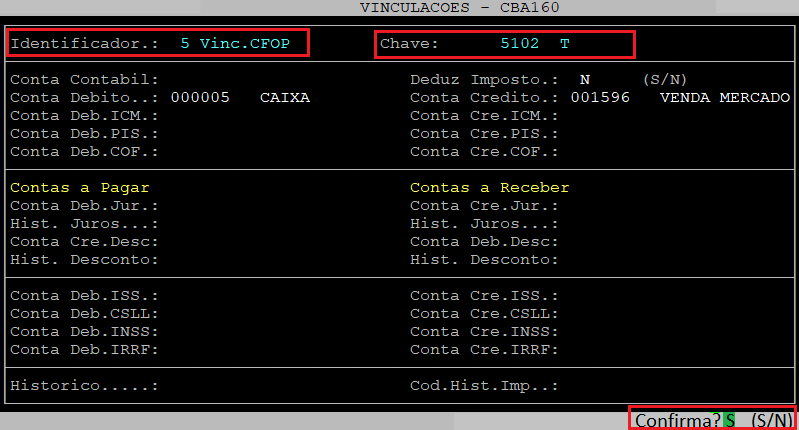 Assim que preencher os campos do quadro acima, pressione a tecla Enter ou S para confirmar a vinculação.