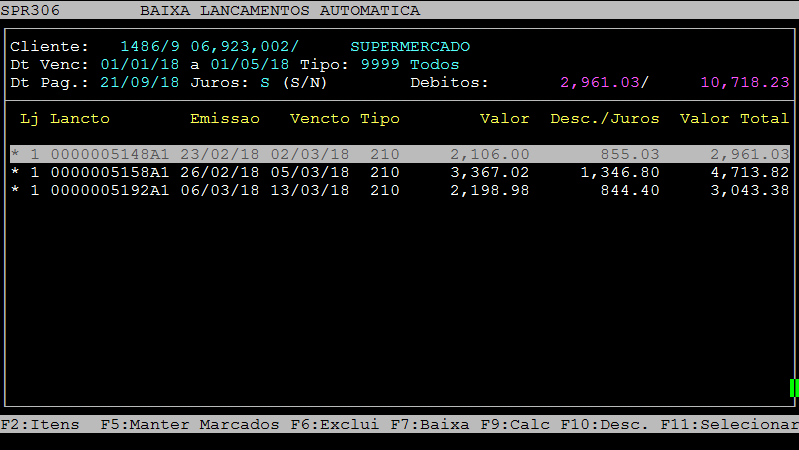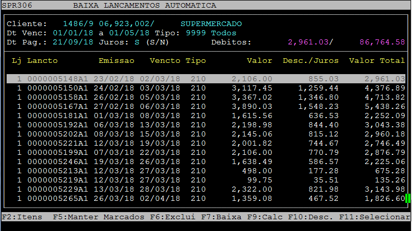 Se o usuário quiser manter apenas alguns lançamentos na tela, eles devem ser marcados pressionando a tecla F11: Selecionar e em seguida F5: Manter Marcados, mantendo na tela somente os lançamentos escolhidos.