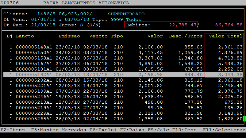 O total dos lançamentos a serem baixados (débitos) serão somados até onde o cursor tiver posicionado, conforme o exemplo abaixo.