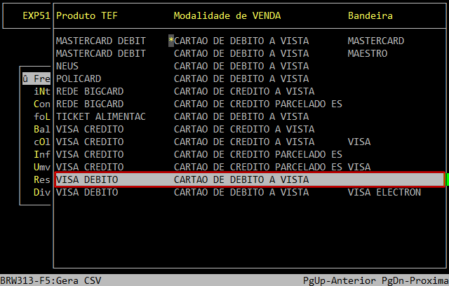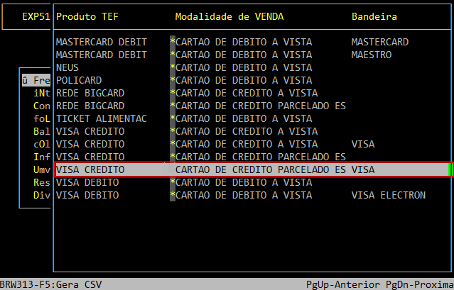 Utilize as setas do teclado para indicar o Produto + Modalidade + Bandeira e pressione a tecla Enter para selecionar a opção desejada.