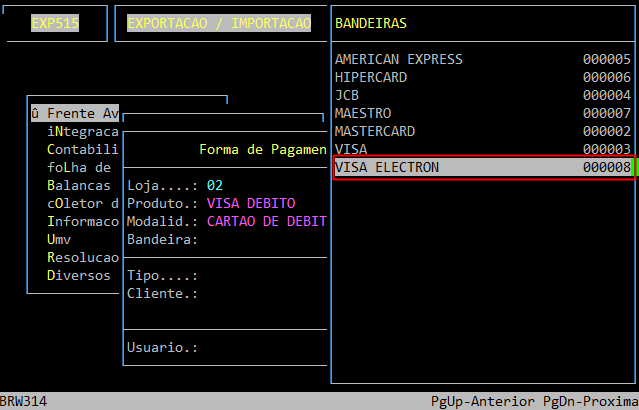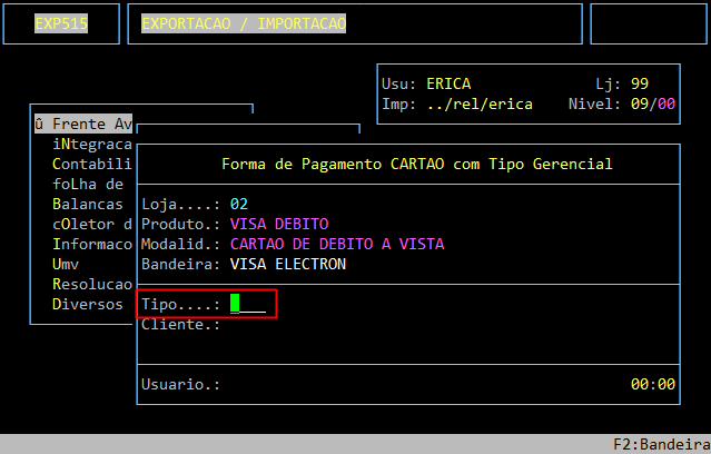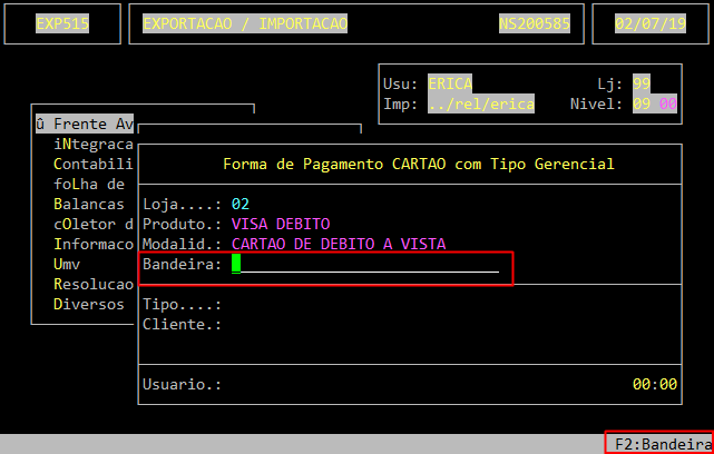 | Bandeira: | Dê F2 para localizar a bandeira do cartão. | |