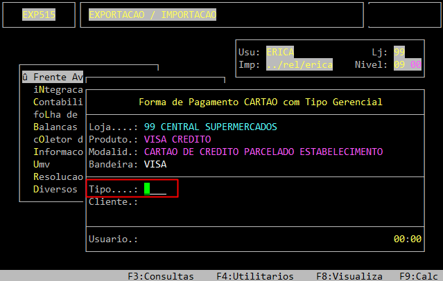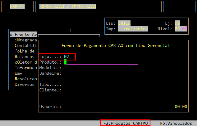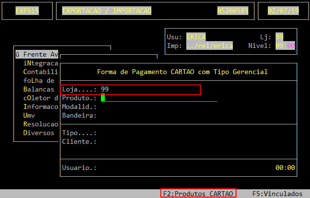 No campo Loja, informe uma loja específica ou 99 para considerar todas. Em seguida, no campo Produto, pressione a tecla F2 para verificar as formas de pagamento provenientes do TEF.