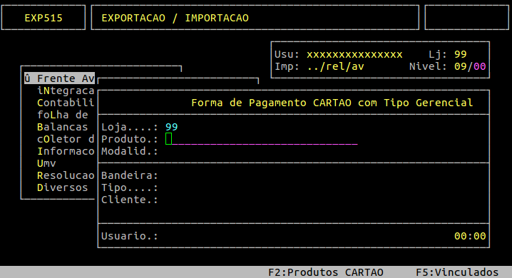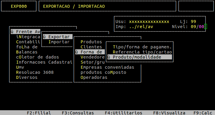 | Localização: | Exportar - Importar Arquivos / Frente Avanco / Exportar / Forma de Pagamento / Produto Modalidade |