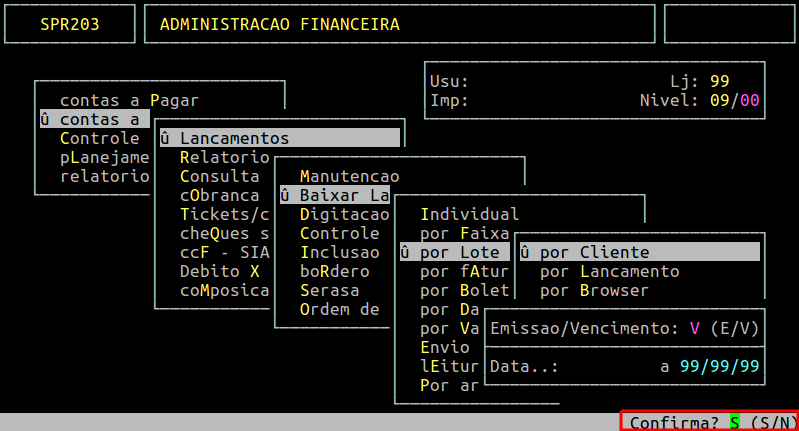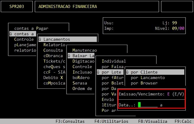 Para alterar o filtro para Emissão ou Vencimento, utilize as setas do teclado para cima e informe E ou V, respectivamente. No caso da data, no campo Data a informe o período desejado ou pressione a tecla Enter para considerar todas as datas (0 a 99/99/99) e confirmar, conforme os exemplo abaixo.